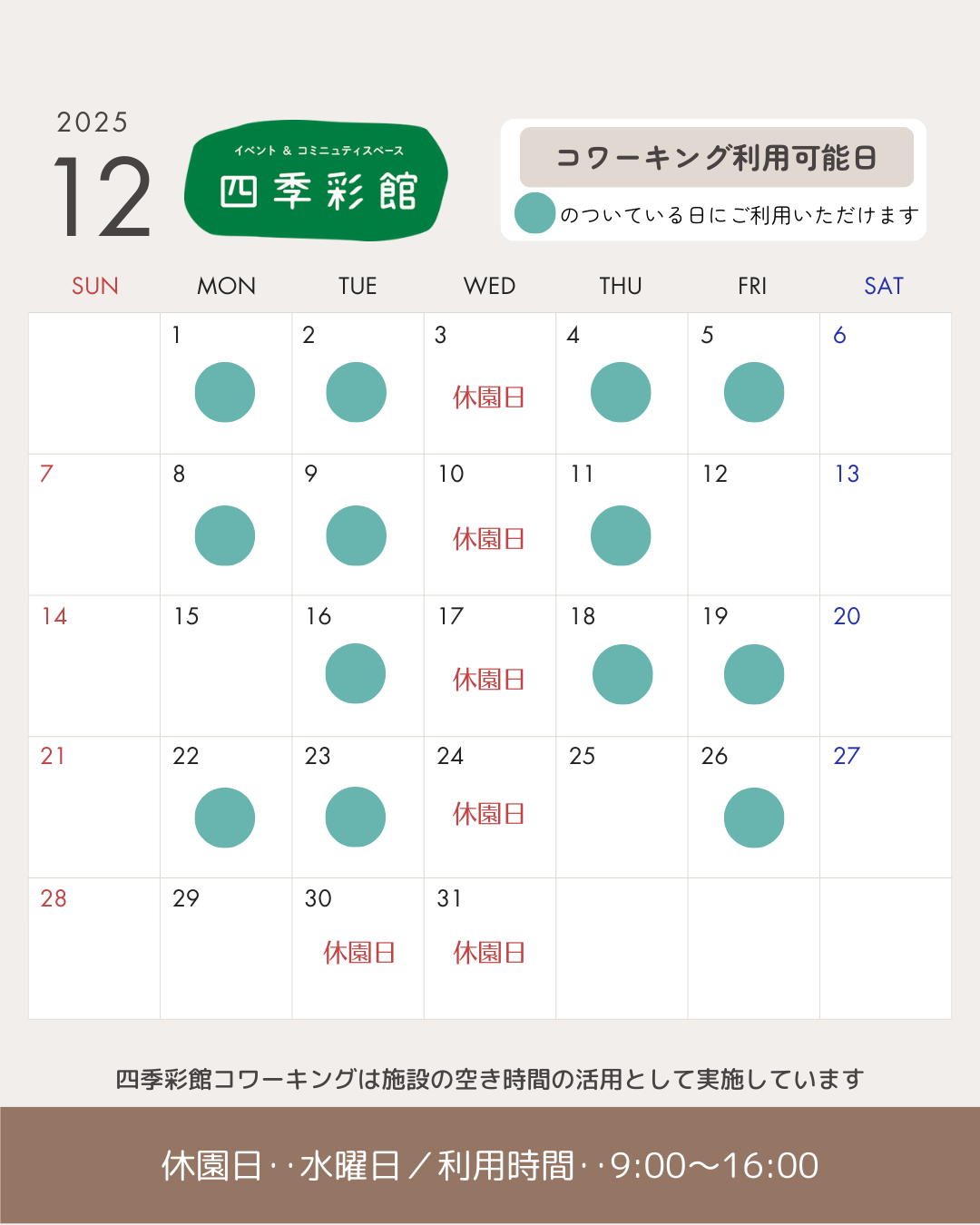 12月のコワーキング利用可能日(一覧)