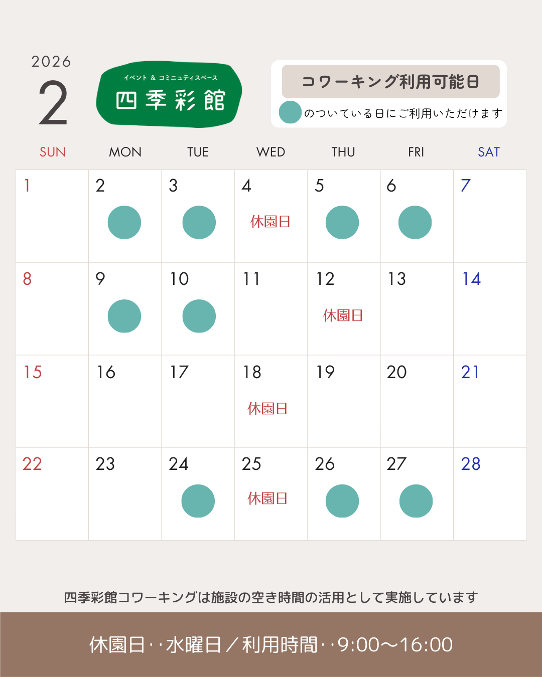 2月のコワーキング利用可能日(一覧)