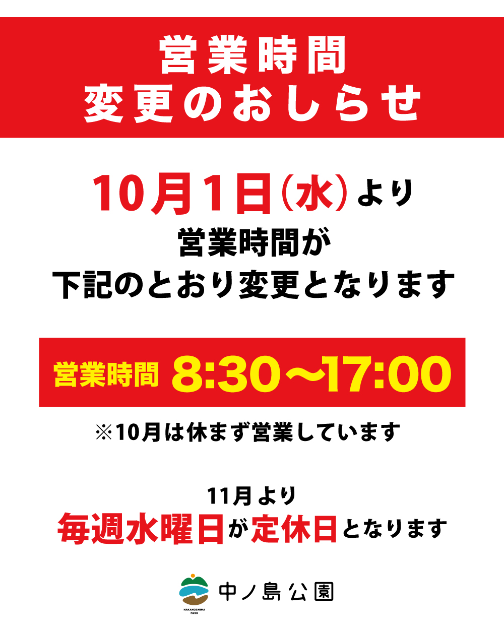 10月1日(水)より、営業時間を下記の通り変更させていただきます。